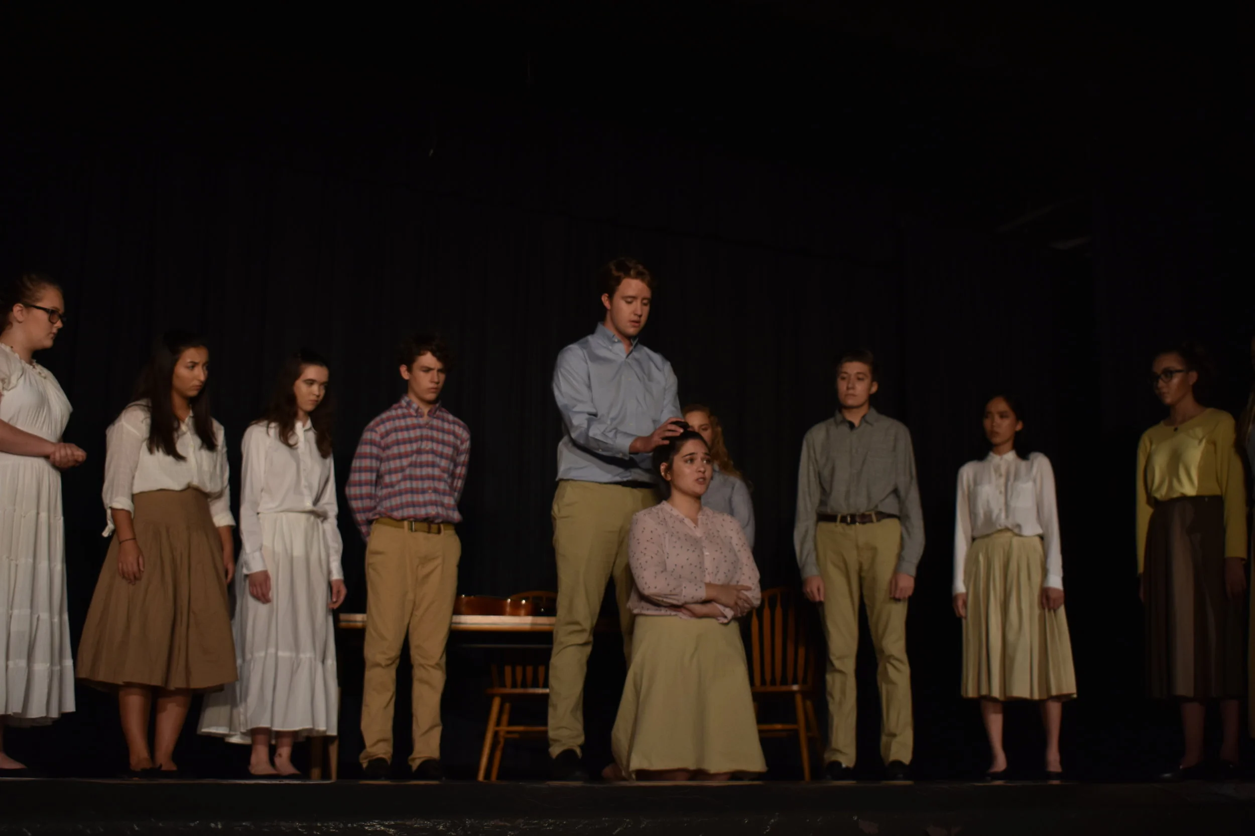 The majority of the performances were stellar, and the costumes, designed by senior Kristie Beeman, perfectly matched the personalities of each character. The hair and makeup of each actor was natural and not overdone, thanks to student makeup artists, seniors Nina Negron and Angelique Ayala. However, the stage was bare at times, causing the setting to be hard to follow. A few times during the play, the only prop on stage was a table, which was constructed by two stools and a plank of wood. While dynamic and easy to carry on and off stage, it did not provide a convincing appearance of a table. To transition between scenes, soft background music was played while the actors carried props on and off stage, which fit the mood of the play. In the transitions and other parts of the play where recorded sound was used, the music and effects were almost too soft, and glitched in places. Lastly, the lighting, managed by senior Quinn Conrad, was used to follow the characters around the stage. When one or two characters were on stage, a single spotlight or part of a stage light was used, and when three or more characters were present, the stage was completely lit up by the stage lights, set up behind the last row of seats.