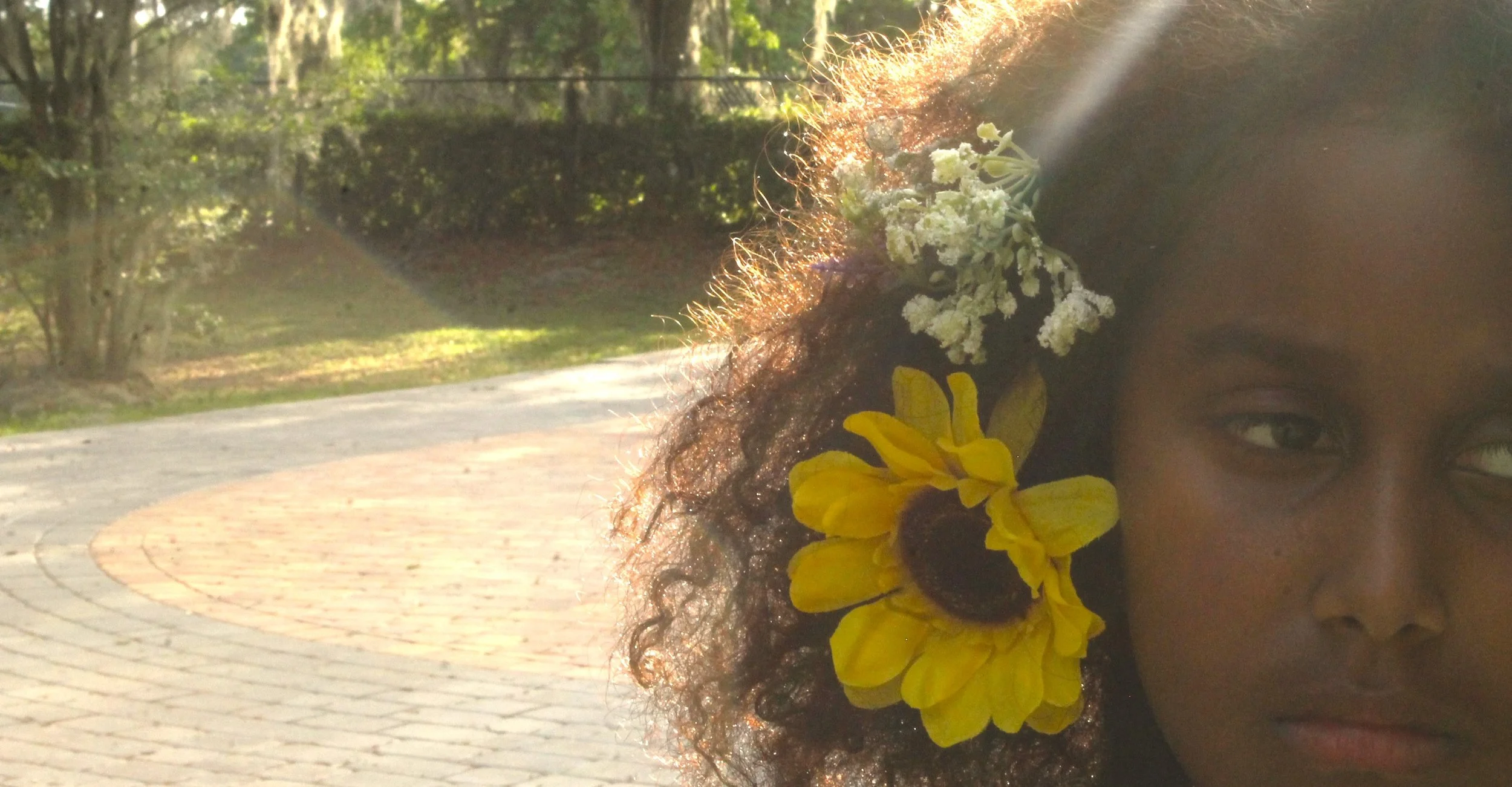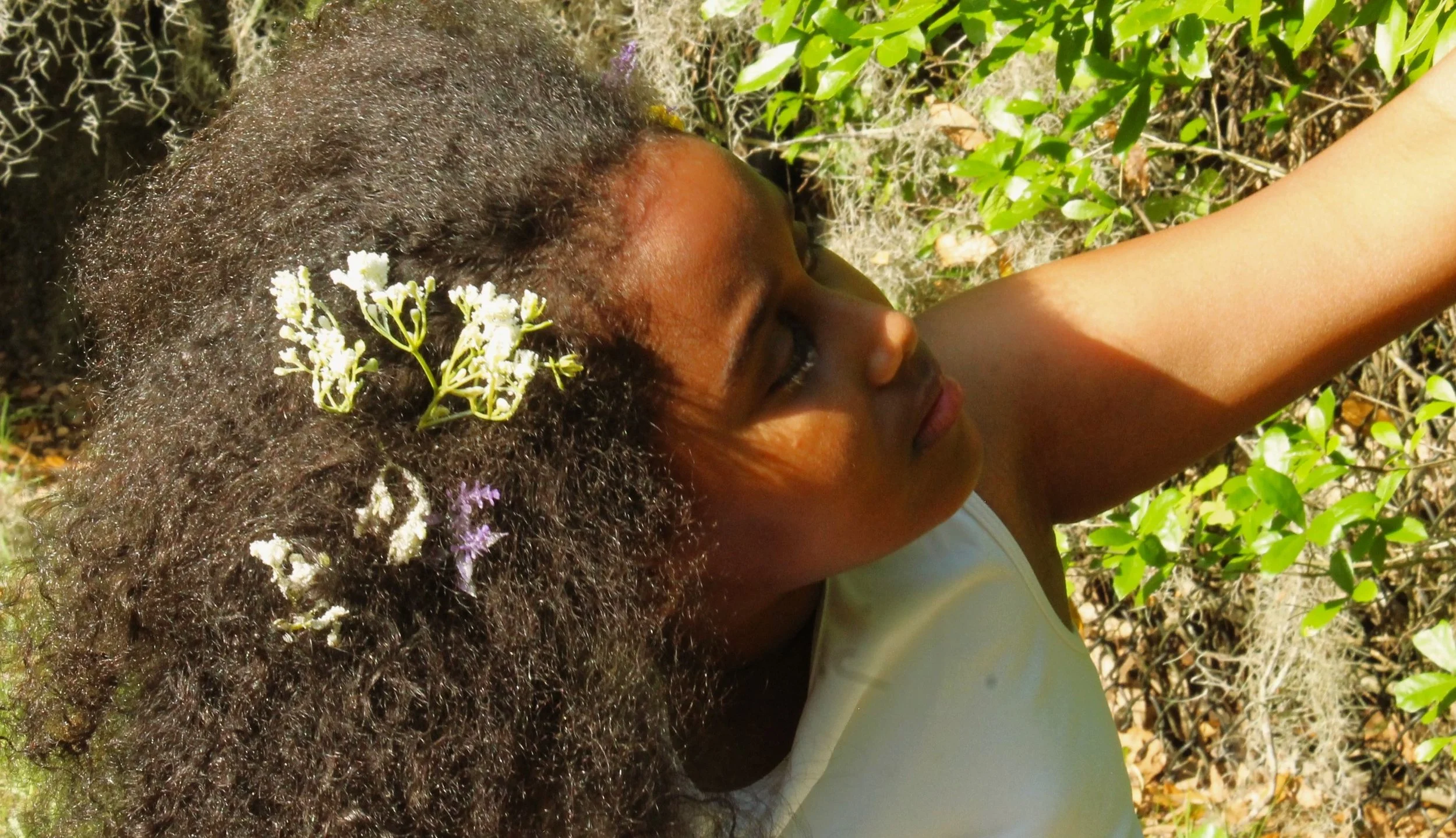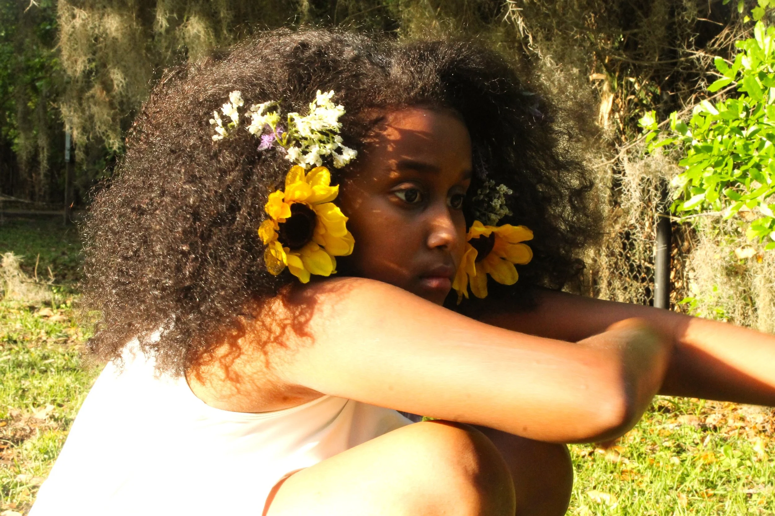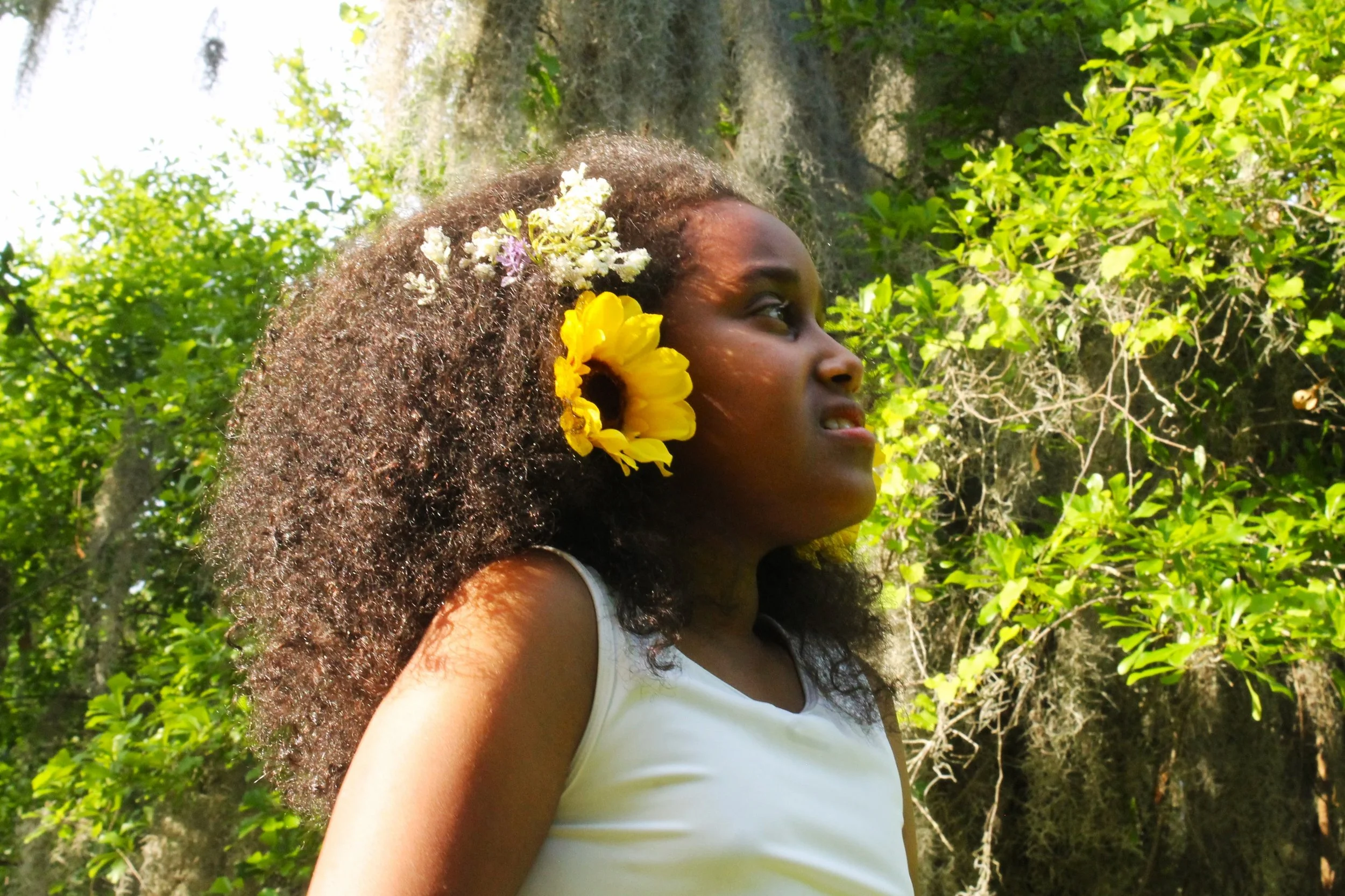 A contemplative girl and her ‘fro are basking in the spring sunlight.